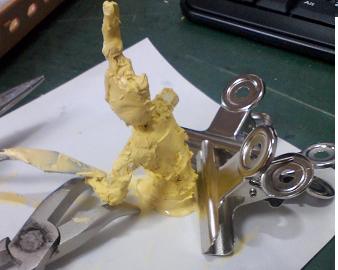 紙の上にポリパテを盛って、上に製作途中のフィギュアを乗せて、固定しておいた